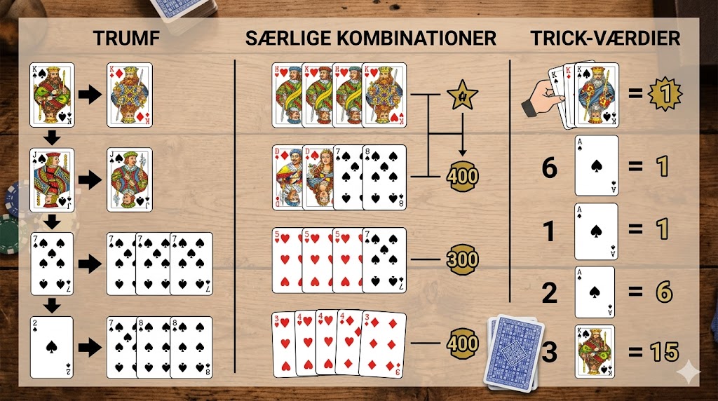 | Kortspil | Standard 52 kort (jokere er valgfrie) |